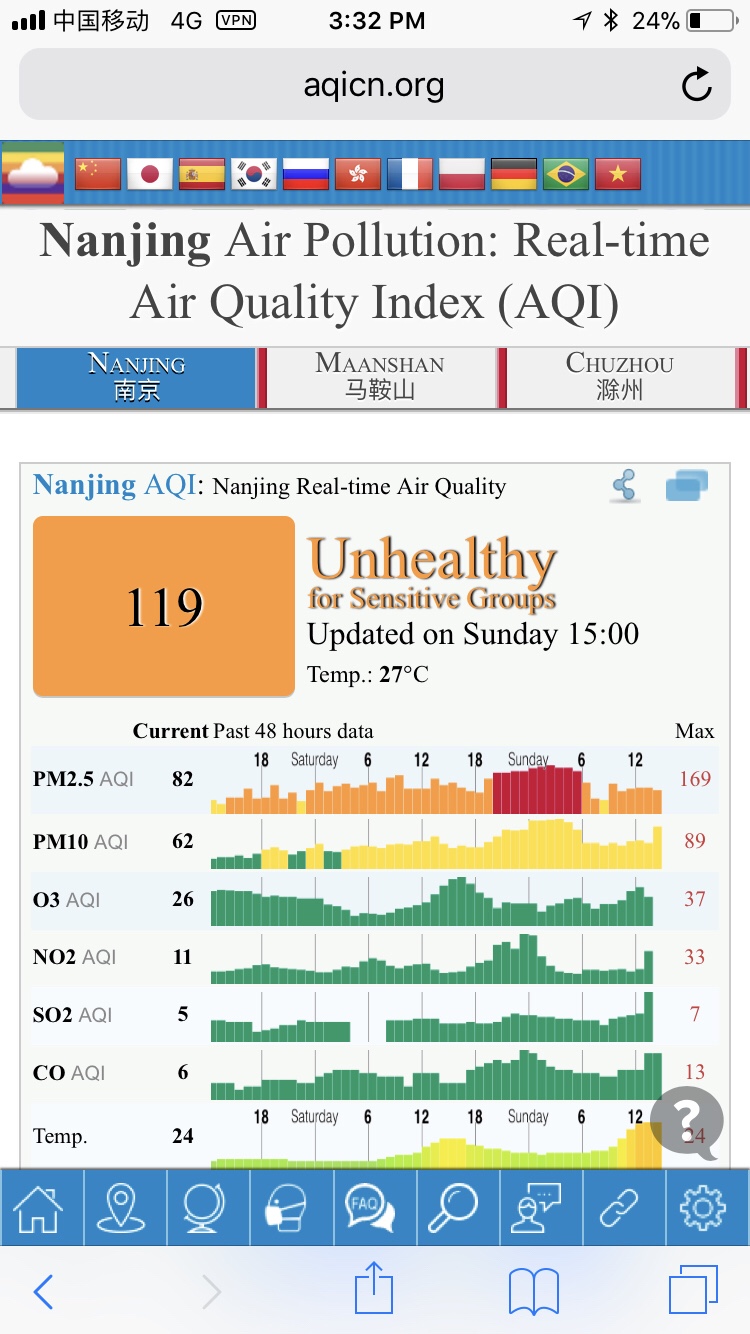 Four days into our three year stint in Nanjing and we’re already feeling it. It’s invisible on the street. Ride an elevator, as few as a half dozen floors, and you begin to realize the air you’re breathing is less than ideal. Even on a sunny day, a grayish hue persists.